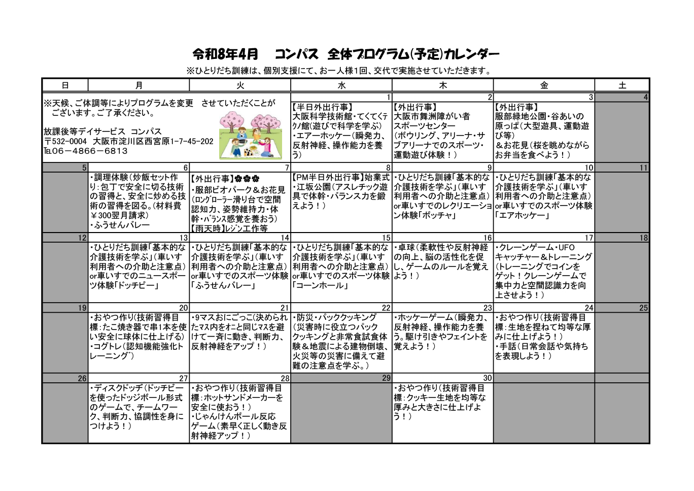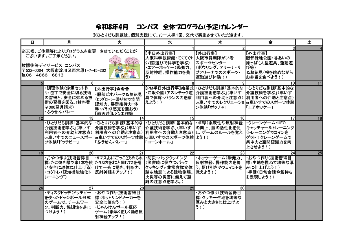 コンパスとは 障がいのある子どもたちの デイサービス ご利用まで 小学1年生~高校3年生 までの受給者証をお持ちの方を 対象としています プログラム 学校帰りや、学校休業日に 楽しい時間を過ごしませんか? アクセス 地下鉄「新大阪」駅徒歩8分 車での送迎もあります!! コンパスからのお知らせ 2026年03月 2025年度事業所における自己評価総括表を公開しました。 2026年03月 2025年度事業所における自己評価結果を公開しました。 2026年03月 2025年度保護者様からの事業所評価結果を公開しました。 2025年01月 支援プログラムの公表について ご質問・メールでのお問い合わせはこちら イベント情報 2026年4月 2026年4月の全体プログラムを更新しました。 2026年3月 おやつ作り&調理体験メニューページを更新しました。 イベントの詳細はこちら ■pdfで見る