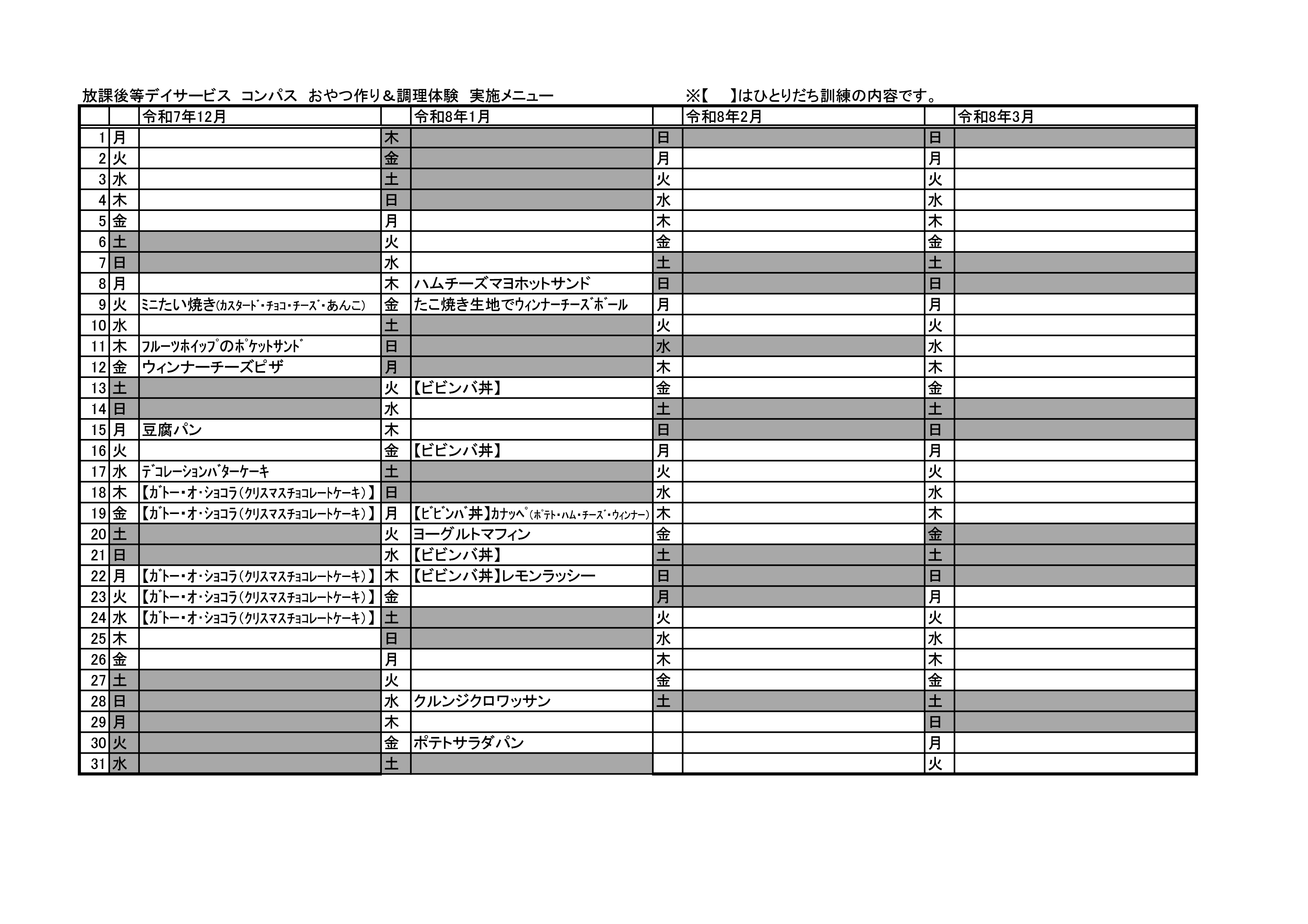 おやつ作り&【調理体験】(2019年12月~2020年3月)